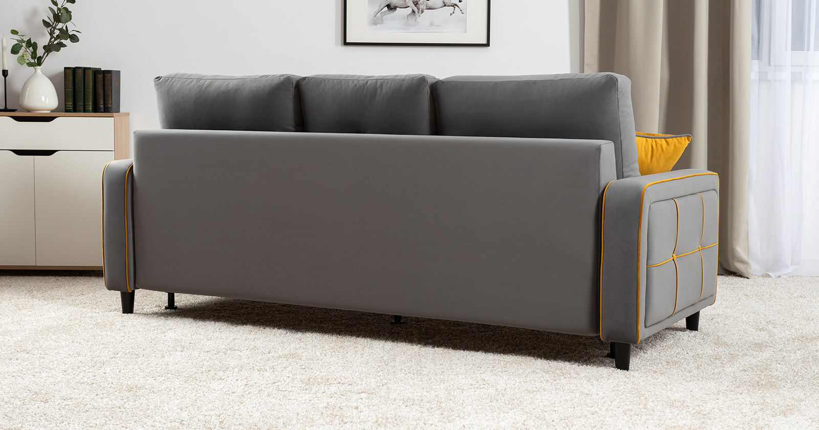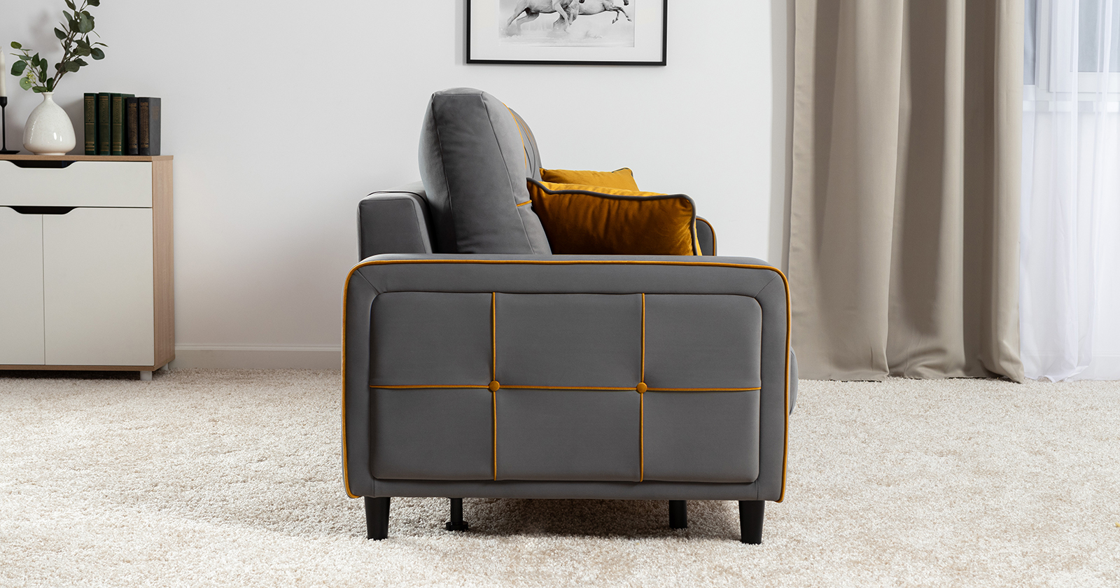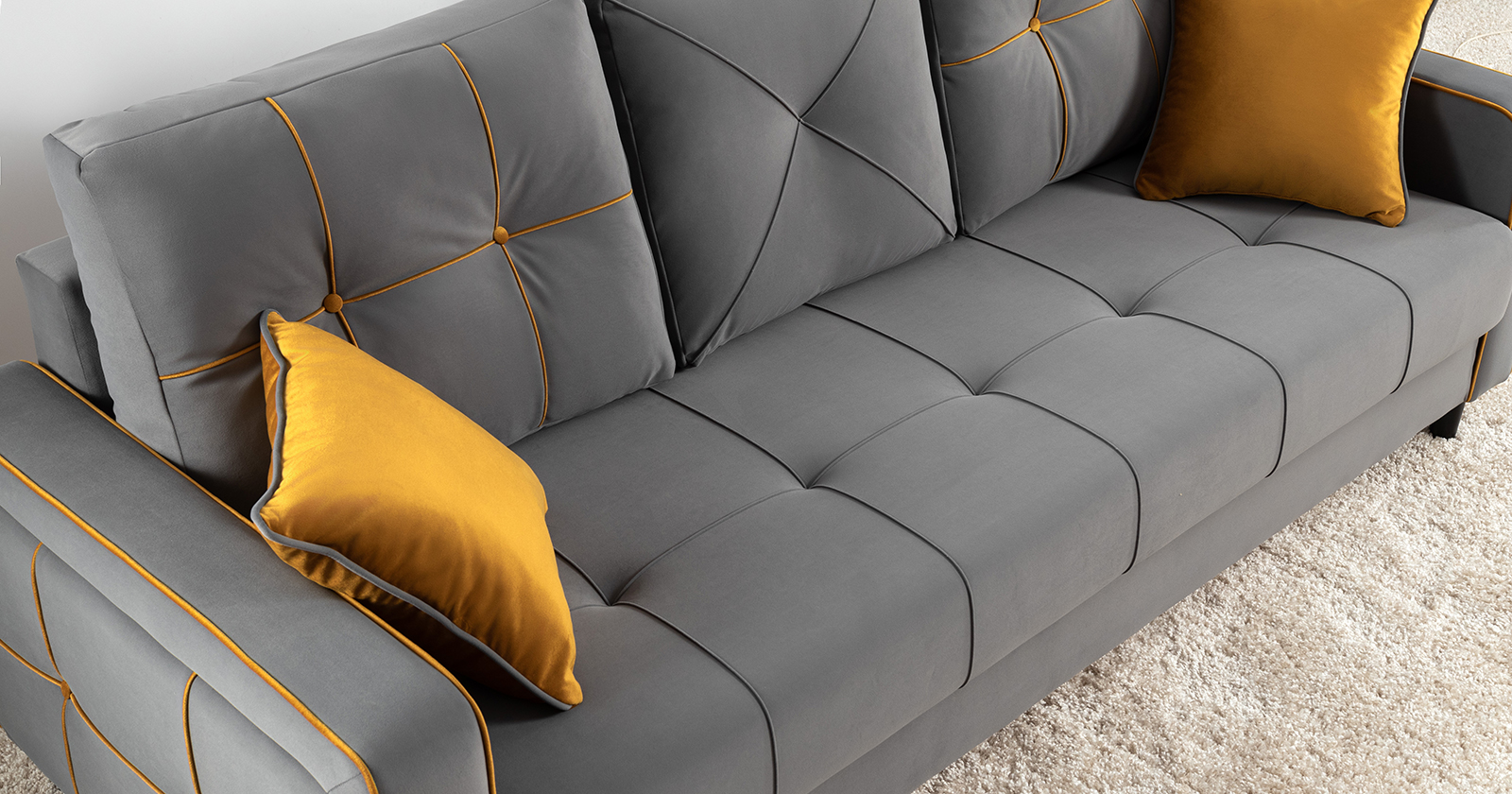 Декоративные канты на подушках и вставке подлокотников. Пуговицы в местах пересечения кантов на подушке и вставке подлокотников. По торцам подлокотников и думках контрастный декоративный кант. Защипы на сиденье и средней большой подушке.