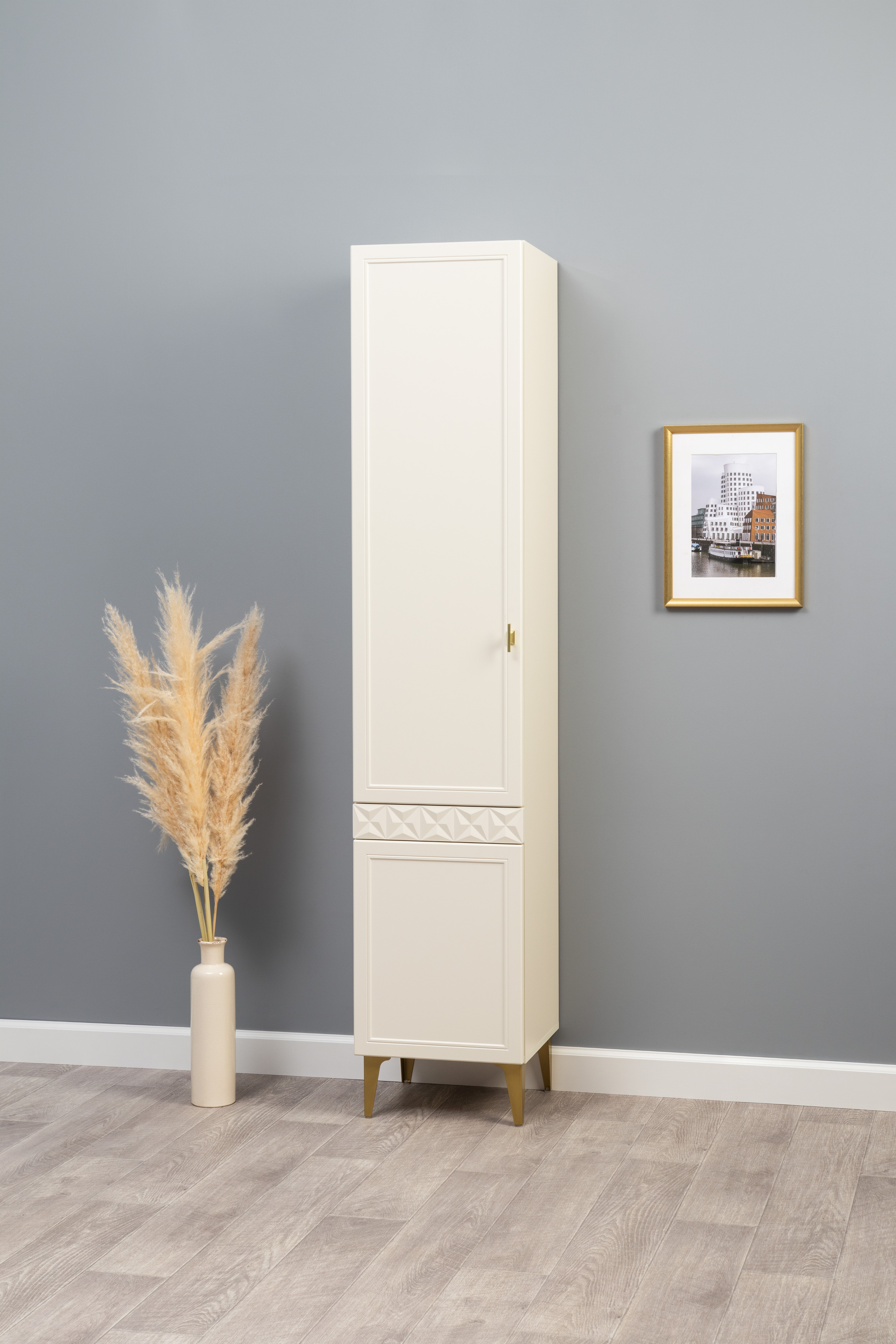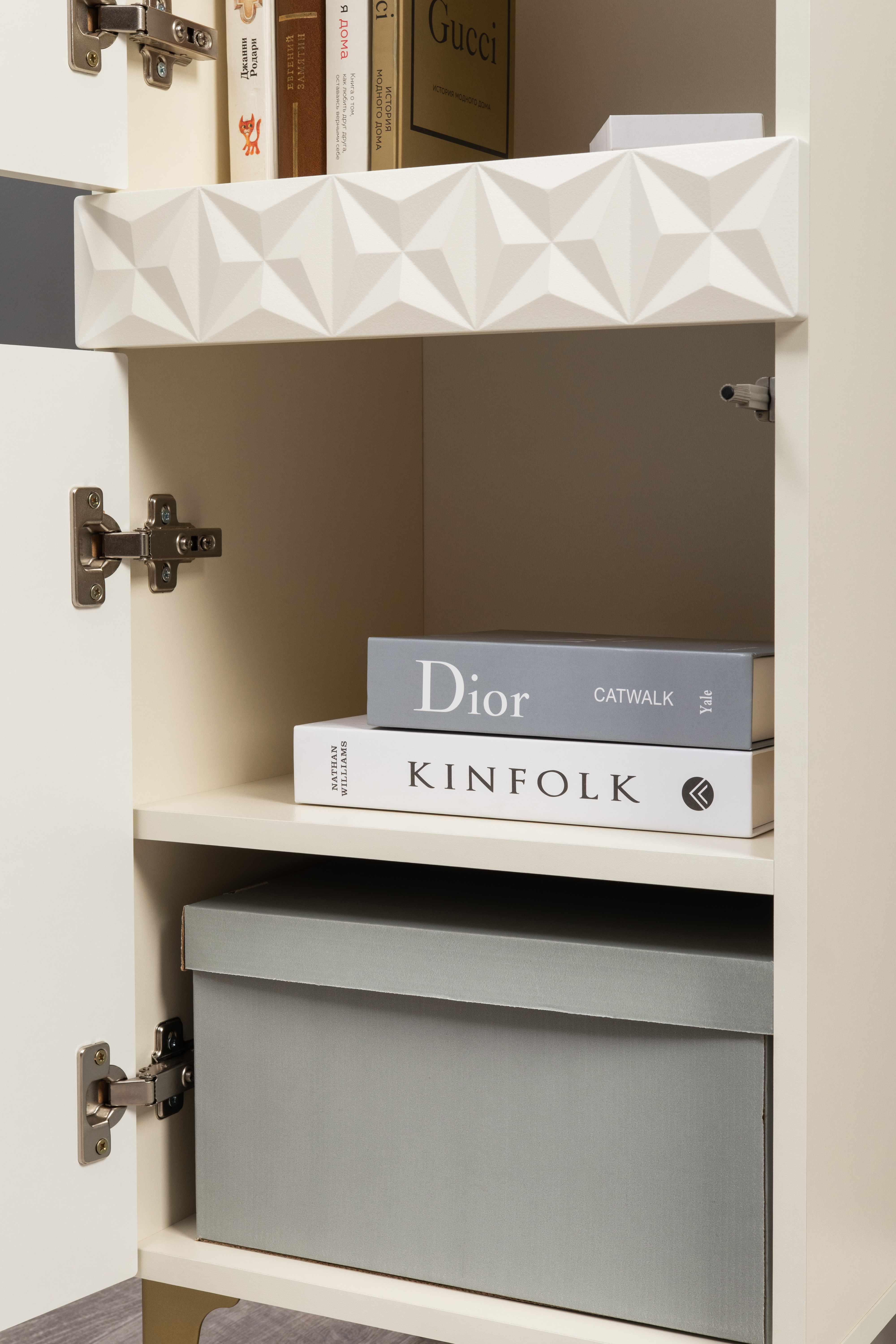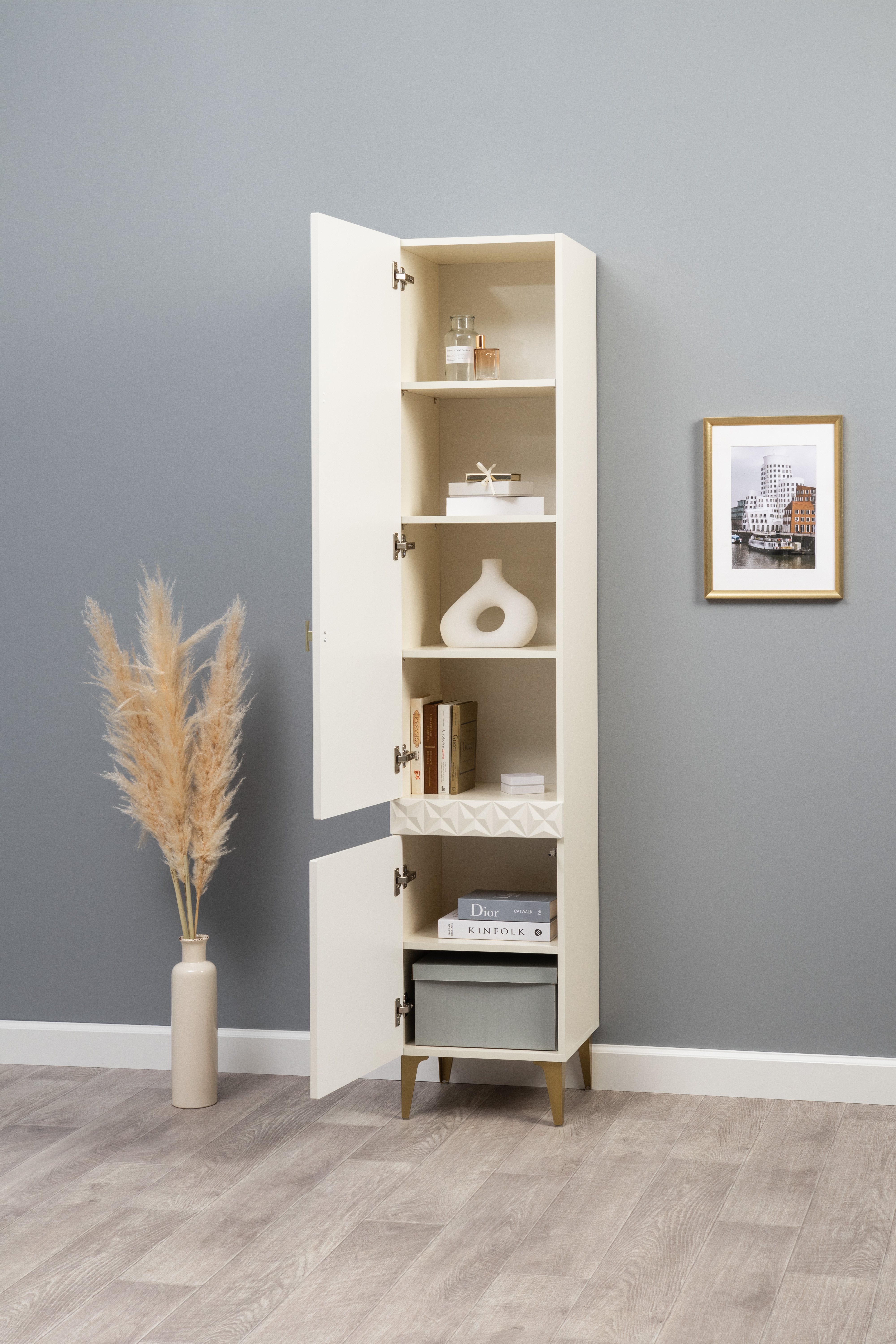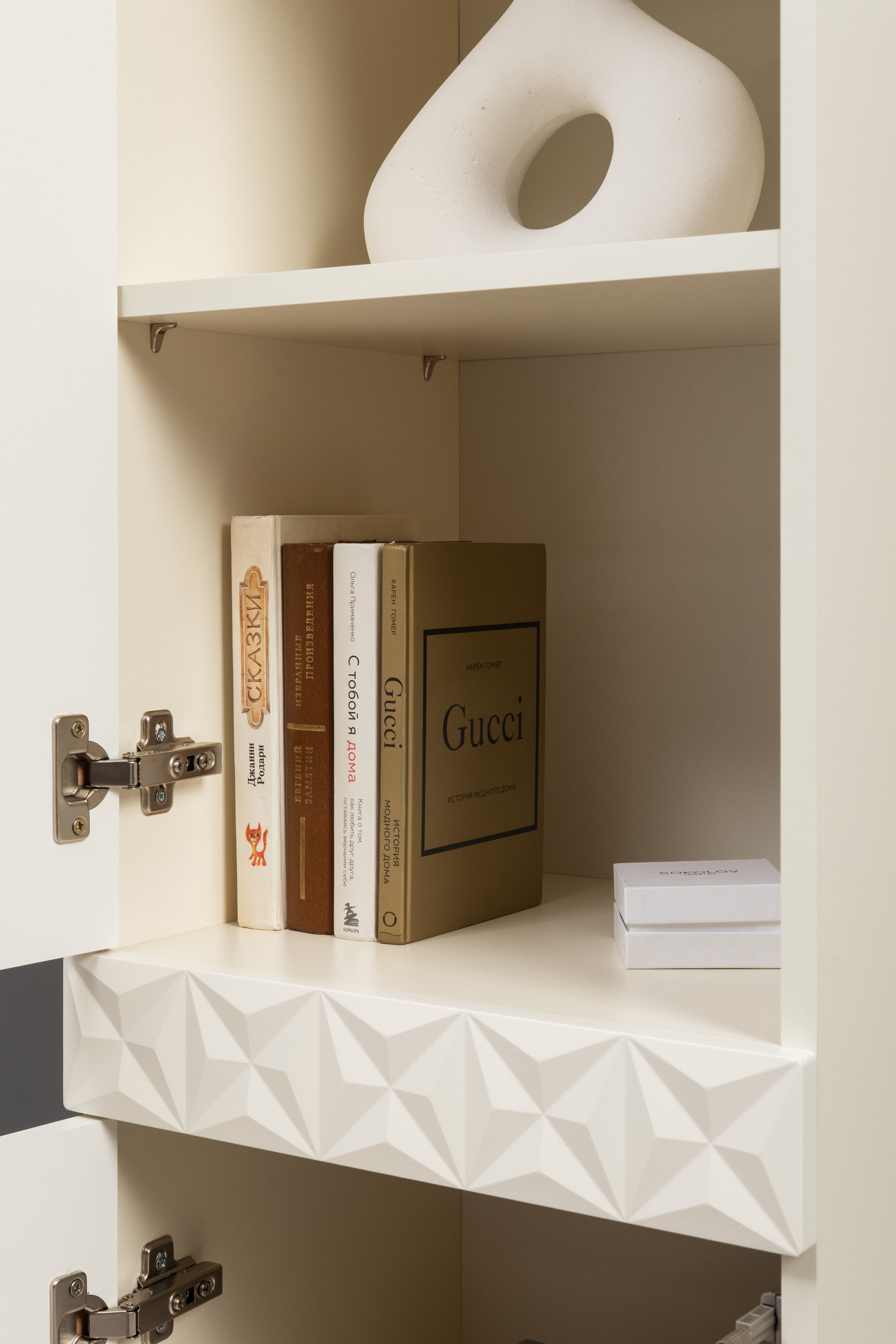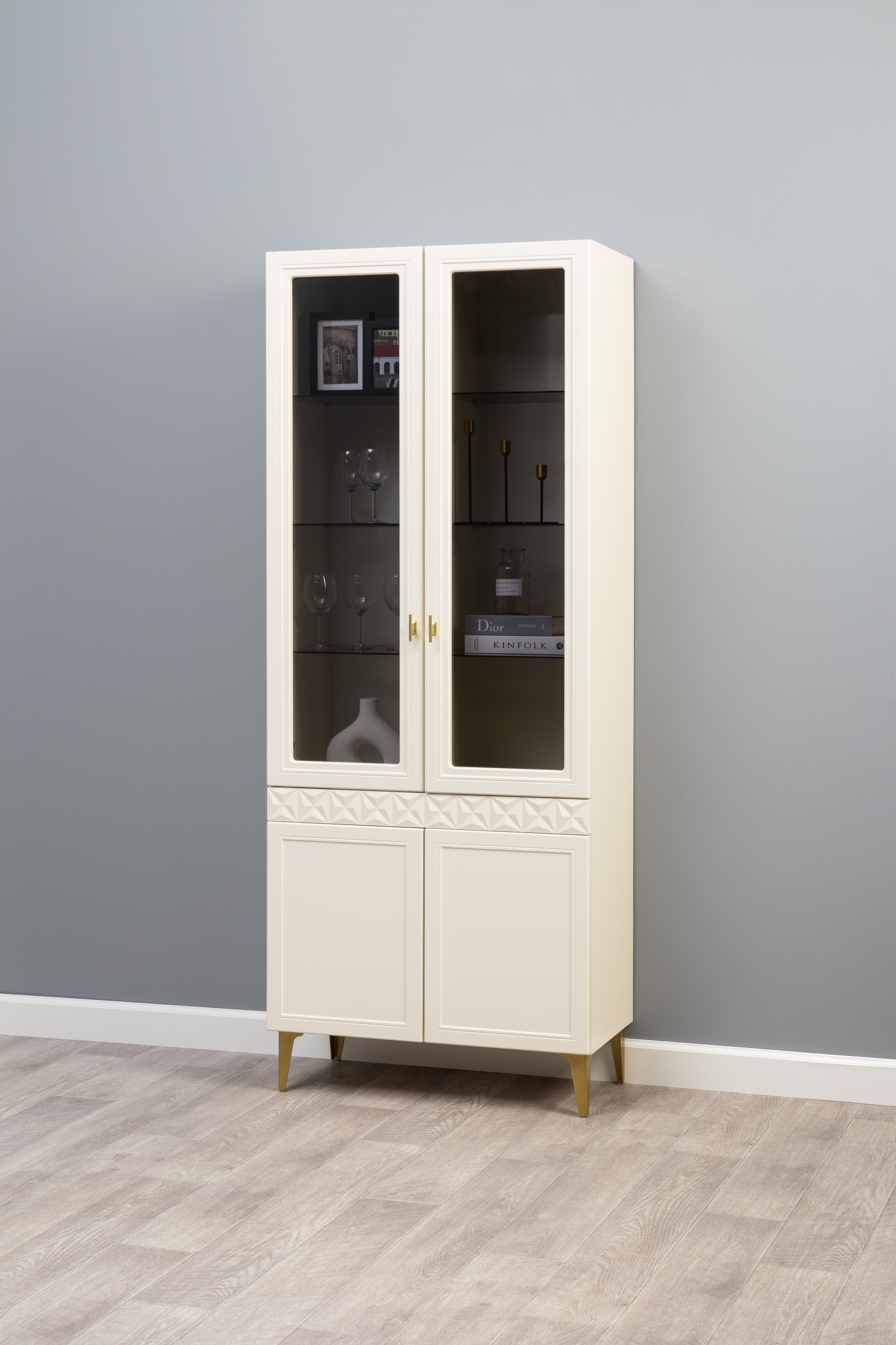 Шкаф-витрина Марион 16.397.01 слоновая кость С341 PE, слоновая кость 6898 ПВХ (собирается на любую сторону)