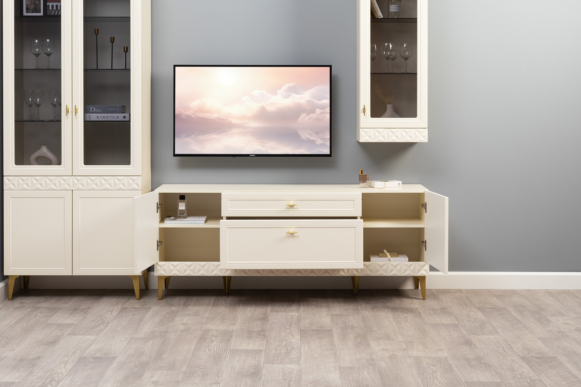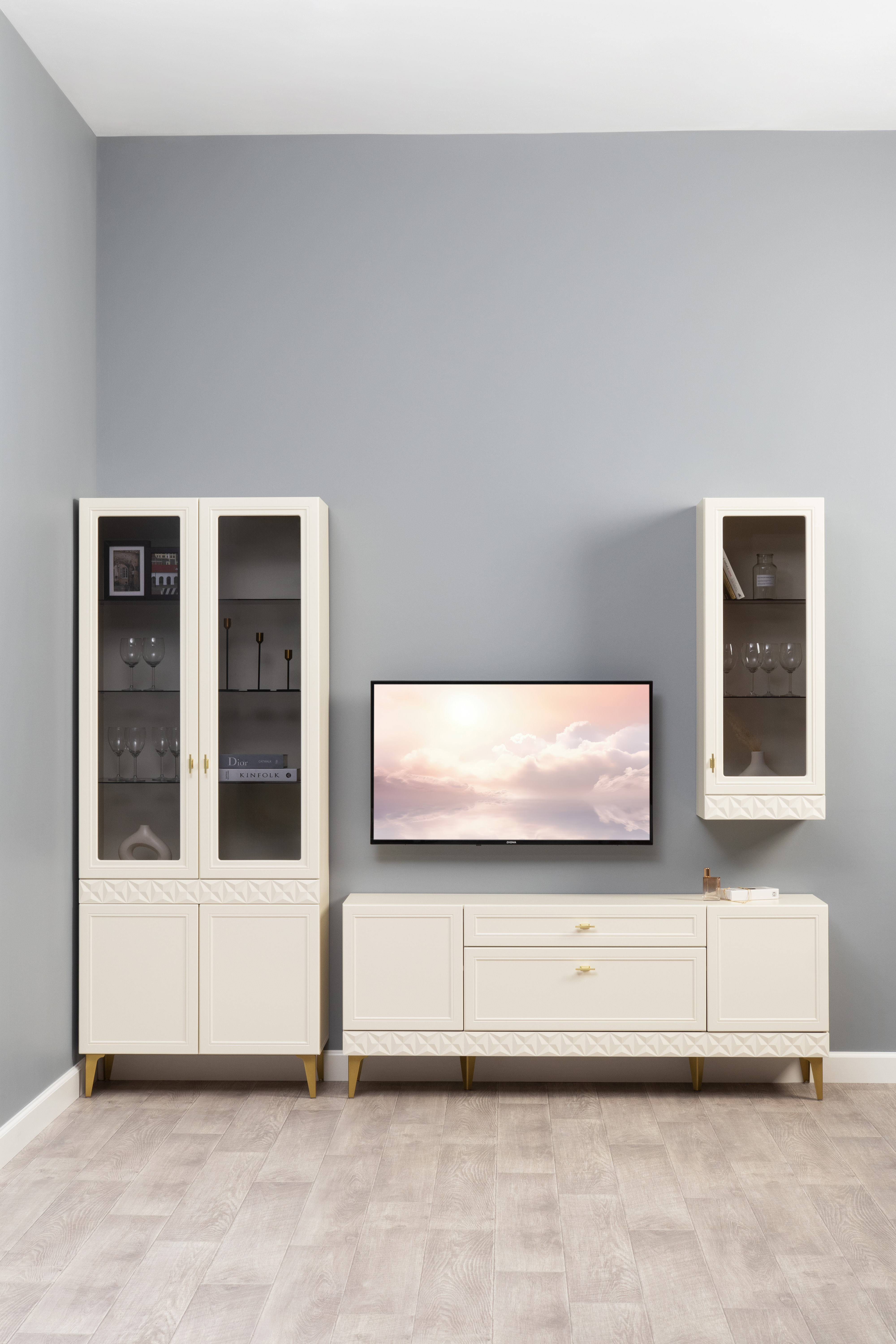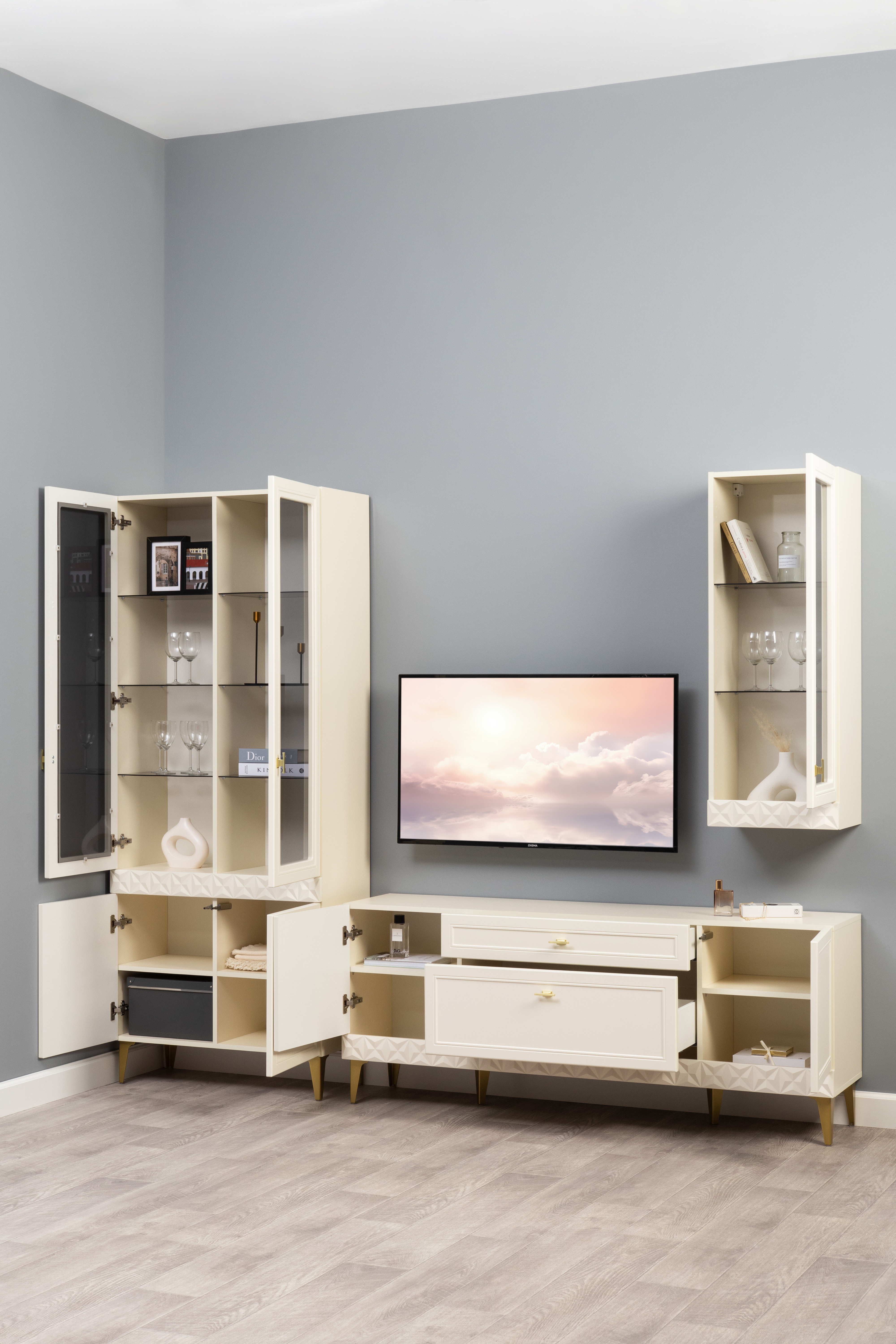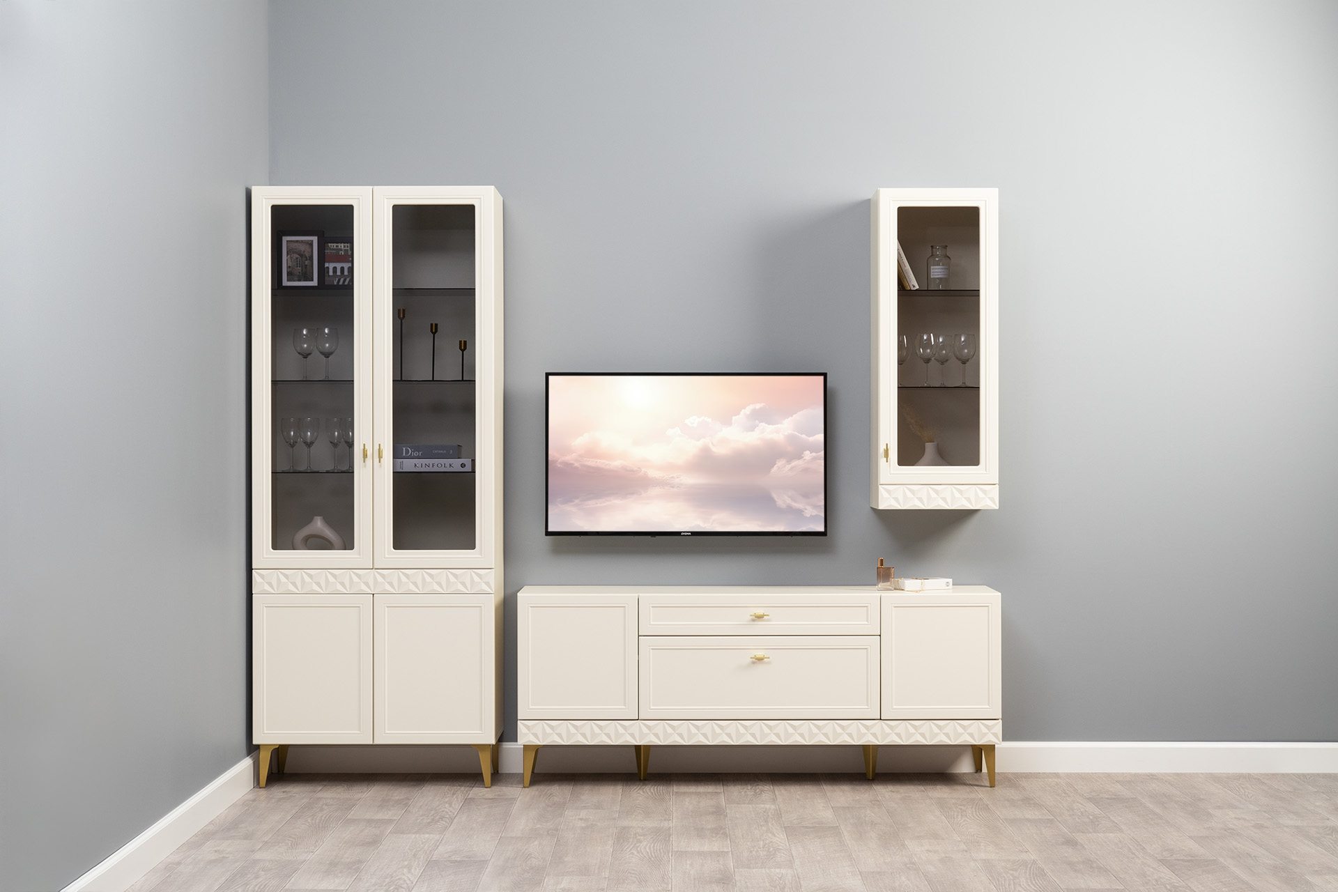 Гостиная Марион композиция 2 слоновая кость С341 PE, слоновая кость 6898 ПВХ, белый PE шагрень (собирается на любую сторону)