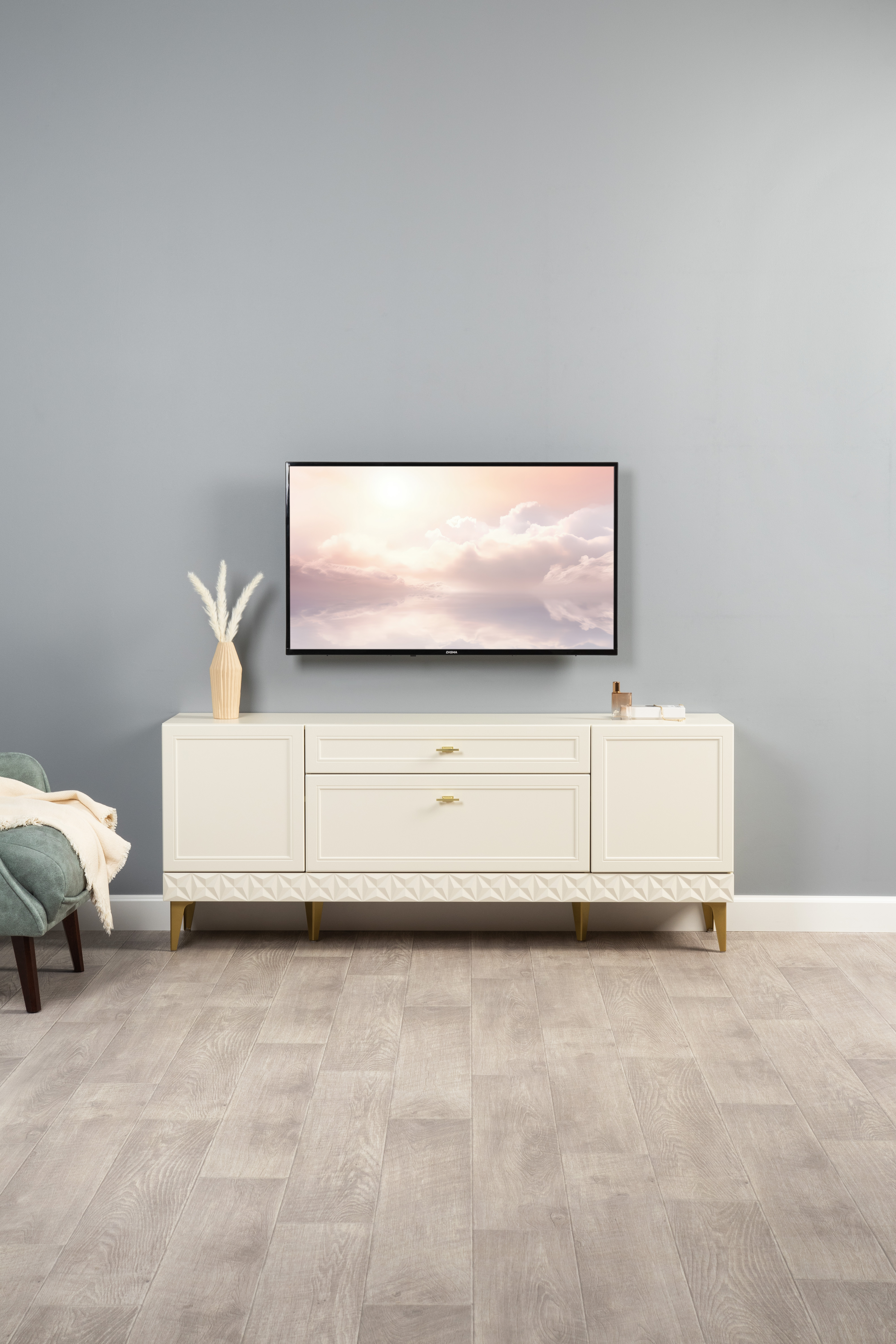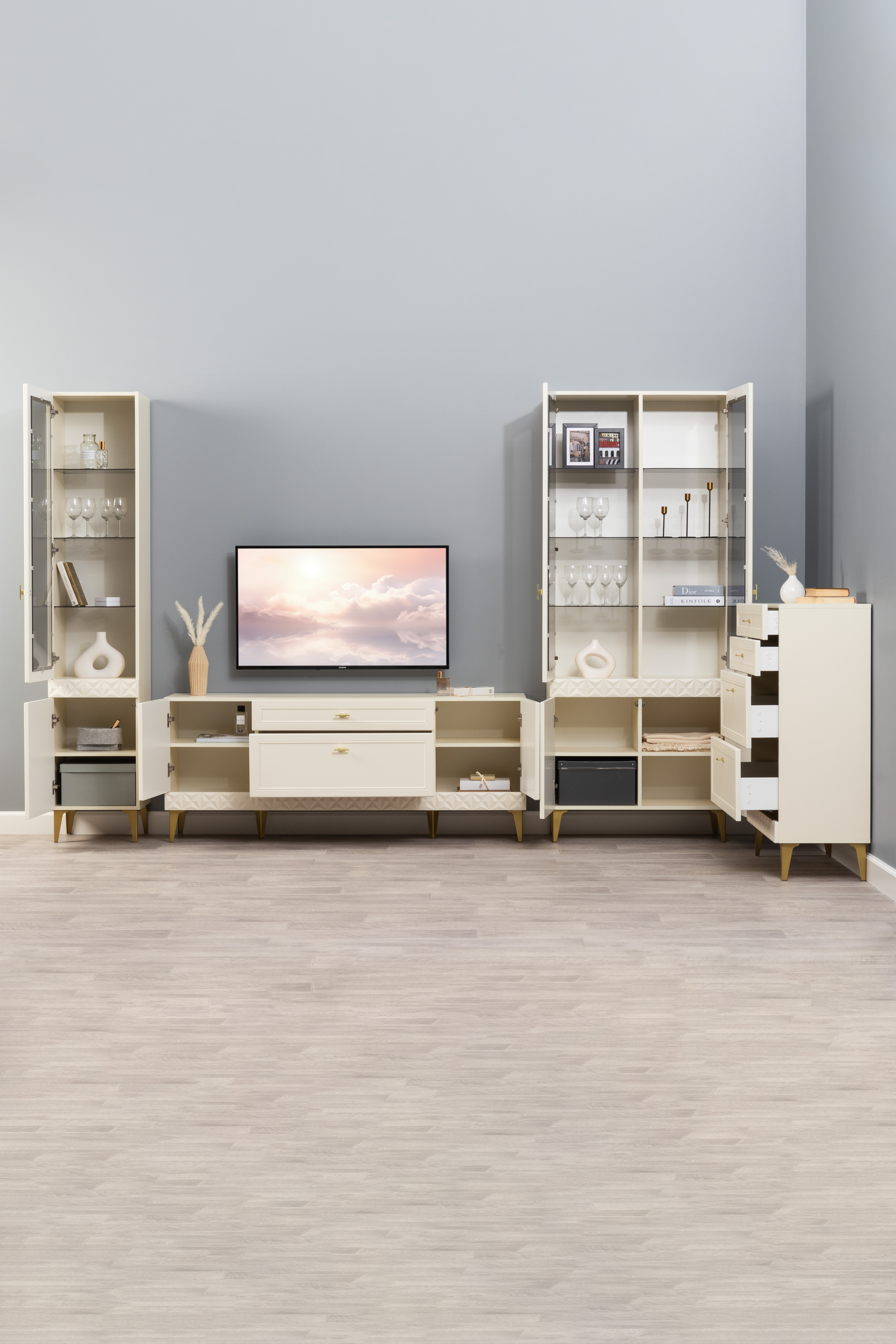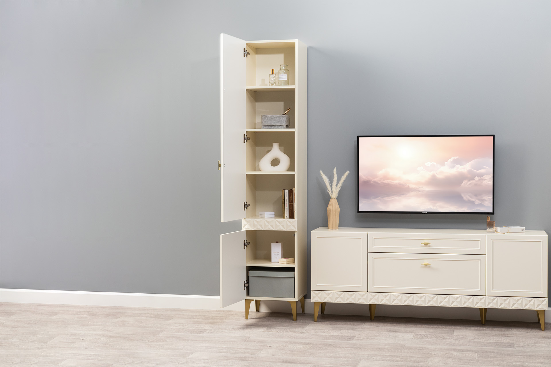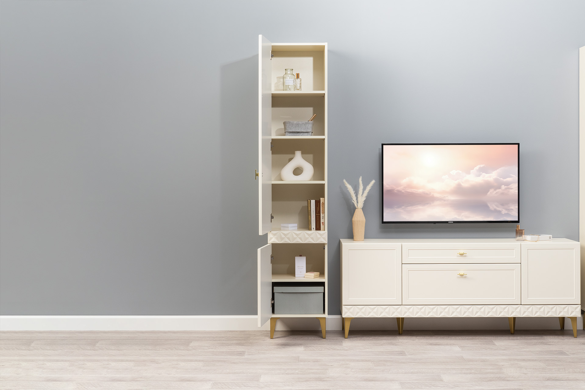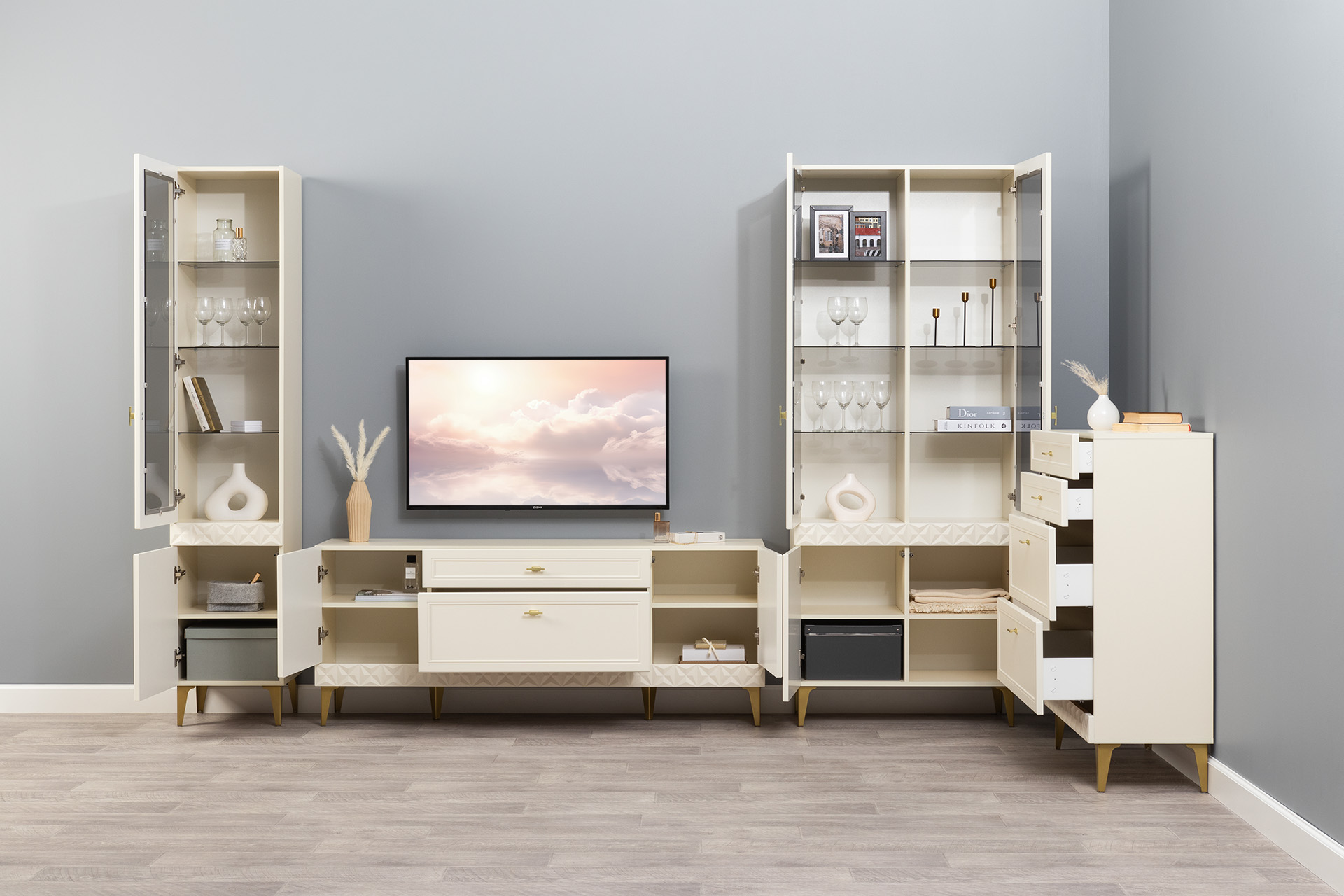 Гостиная Марион композиция 2 слоновая кость С341 PE, слоновая кость 6898 ПВХ, белый PE шагрень (собирается на любую сторону)