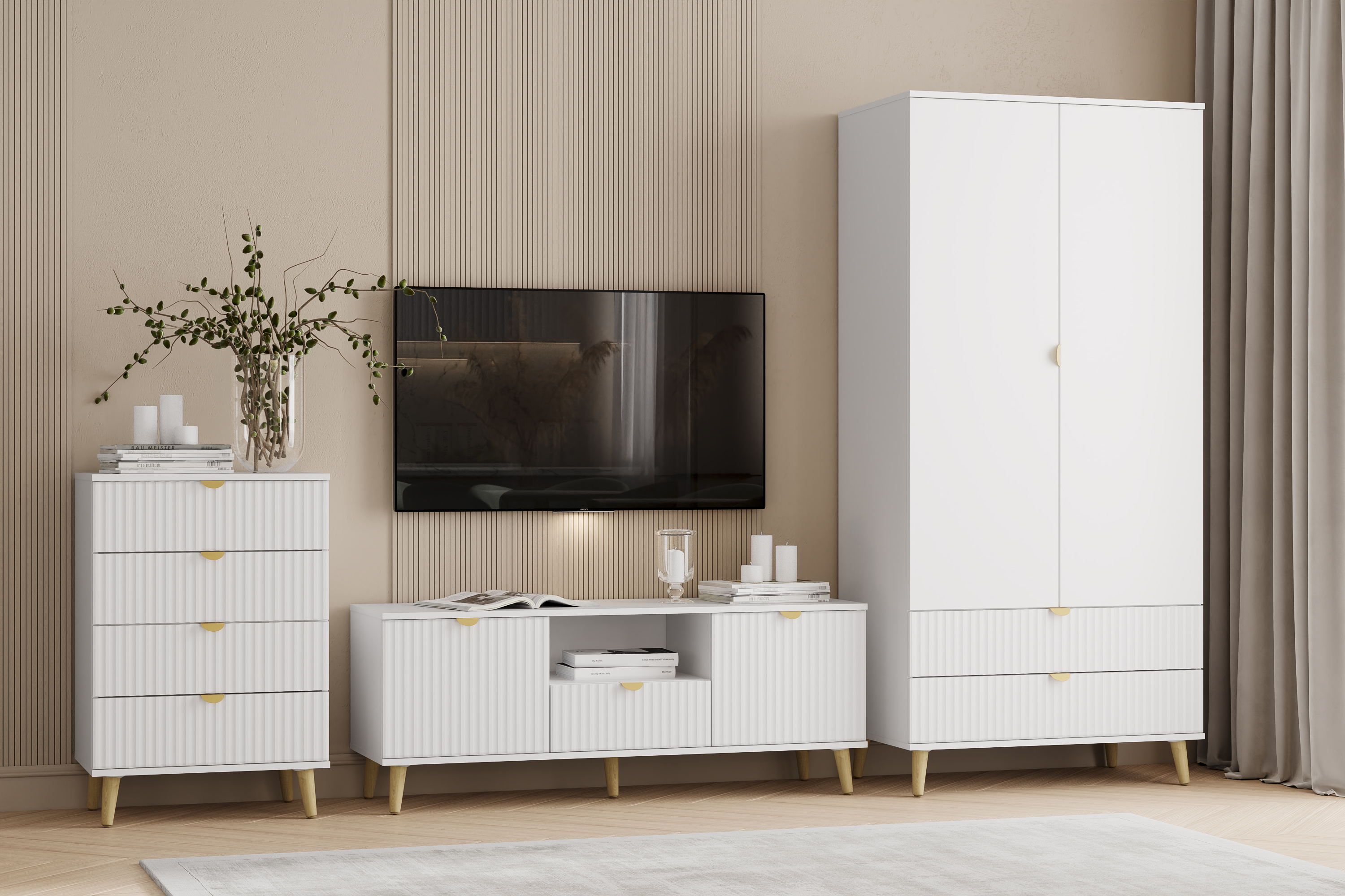 Комод оснащен четырьмя выдвижными ящиками, которые открываются плавно и бесшумно благодаря шариковым направляющим, а высокие опоры облегчают процесс уборки.