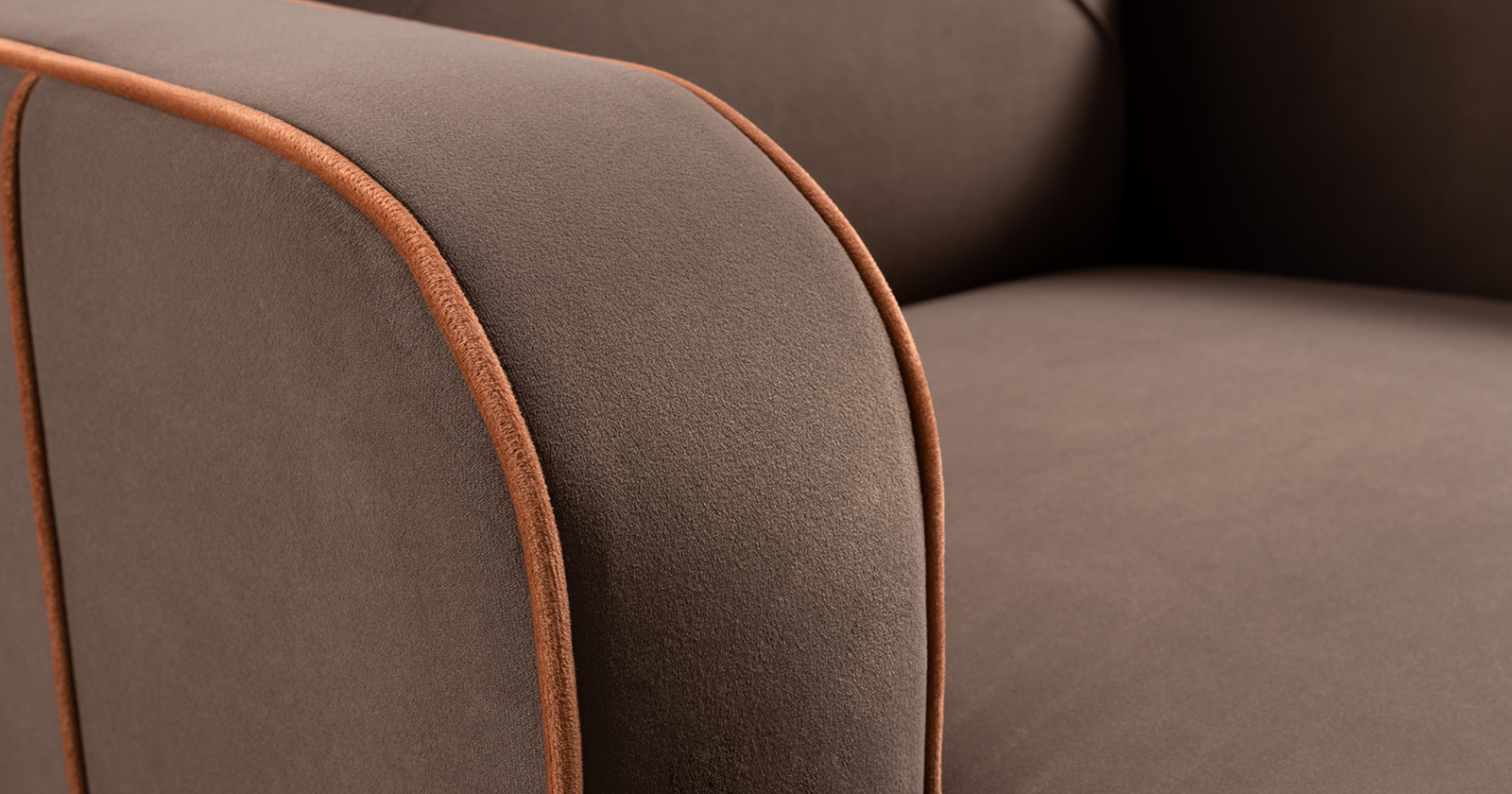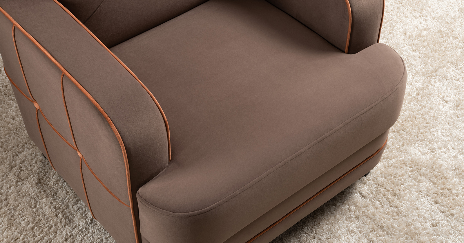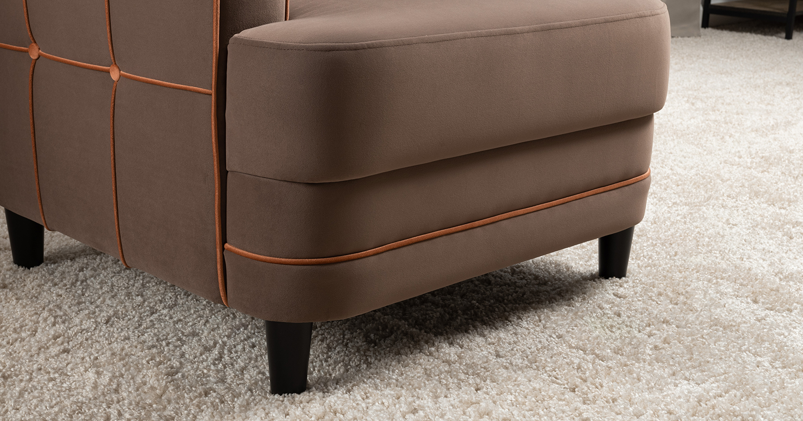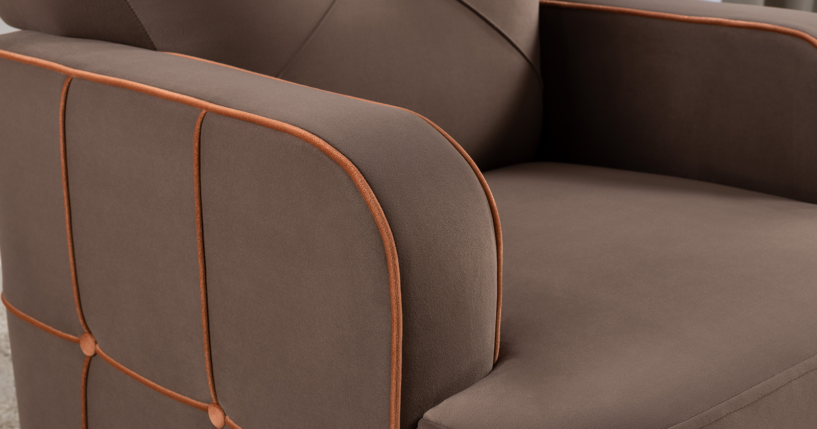 Декоративные канты на вставке подлокотников. Пуговицы в местах пересечения кантов на подушке и вставке подлокотников. По торцам подлокотников и думках контрастный декоративный кант. Защипы на сиденье и подушке.
