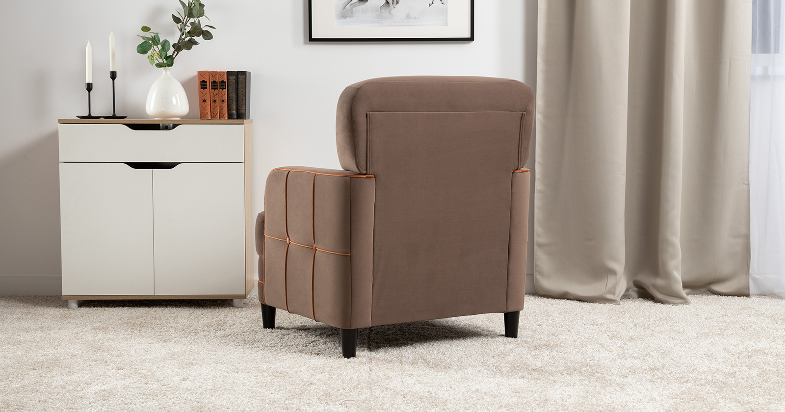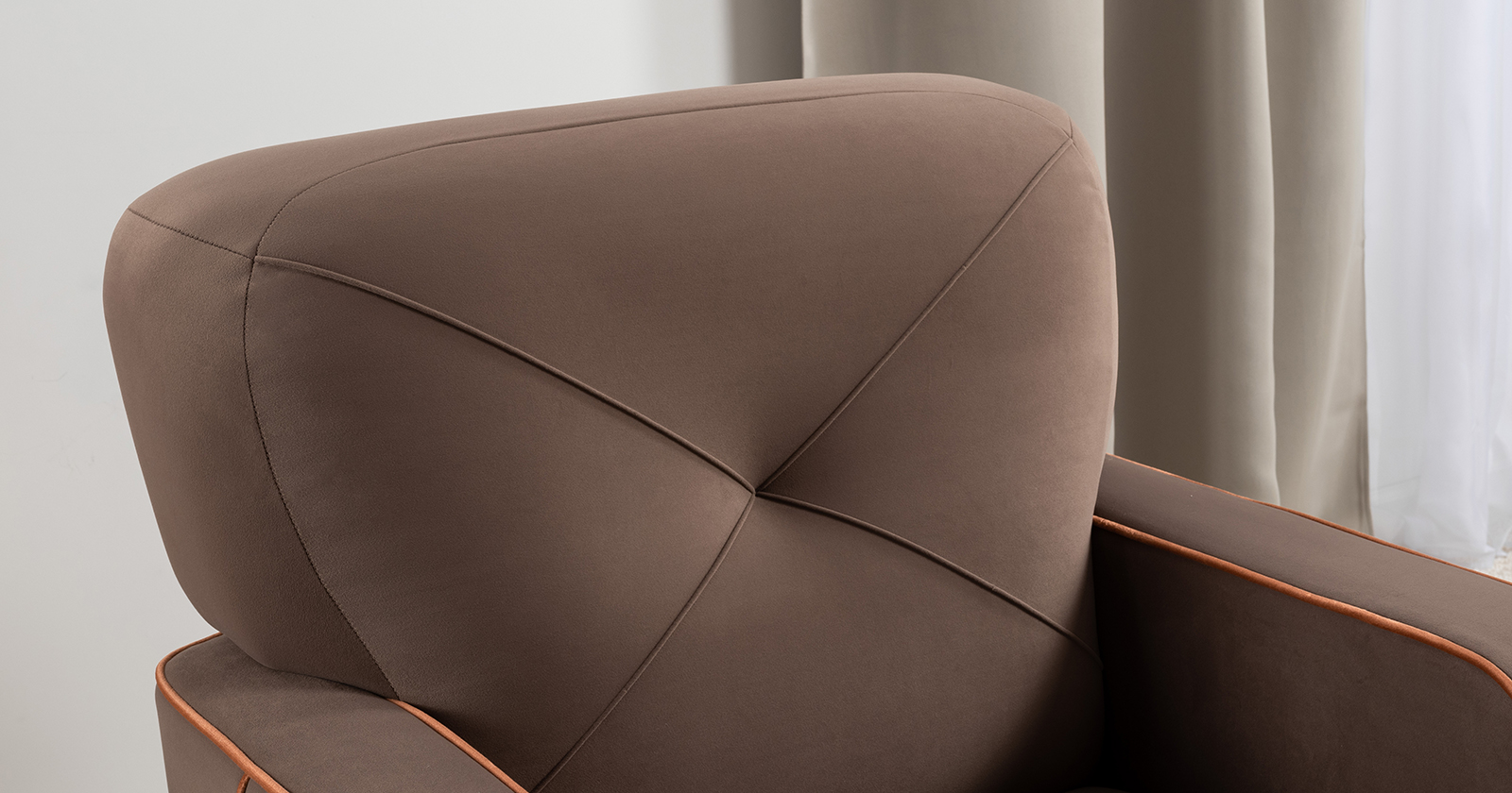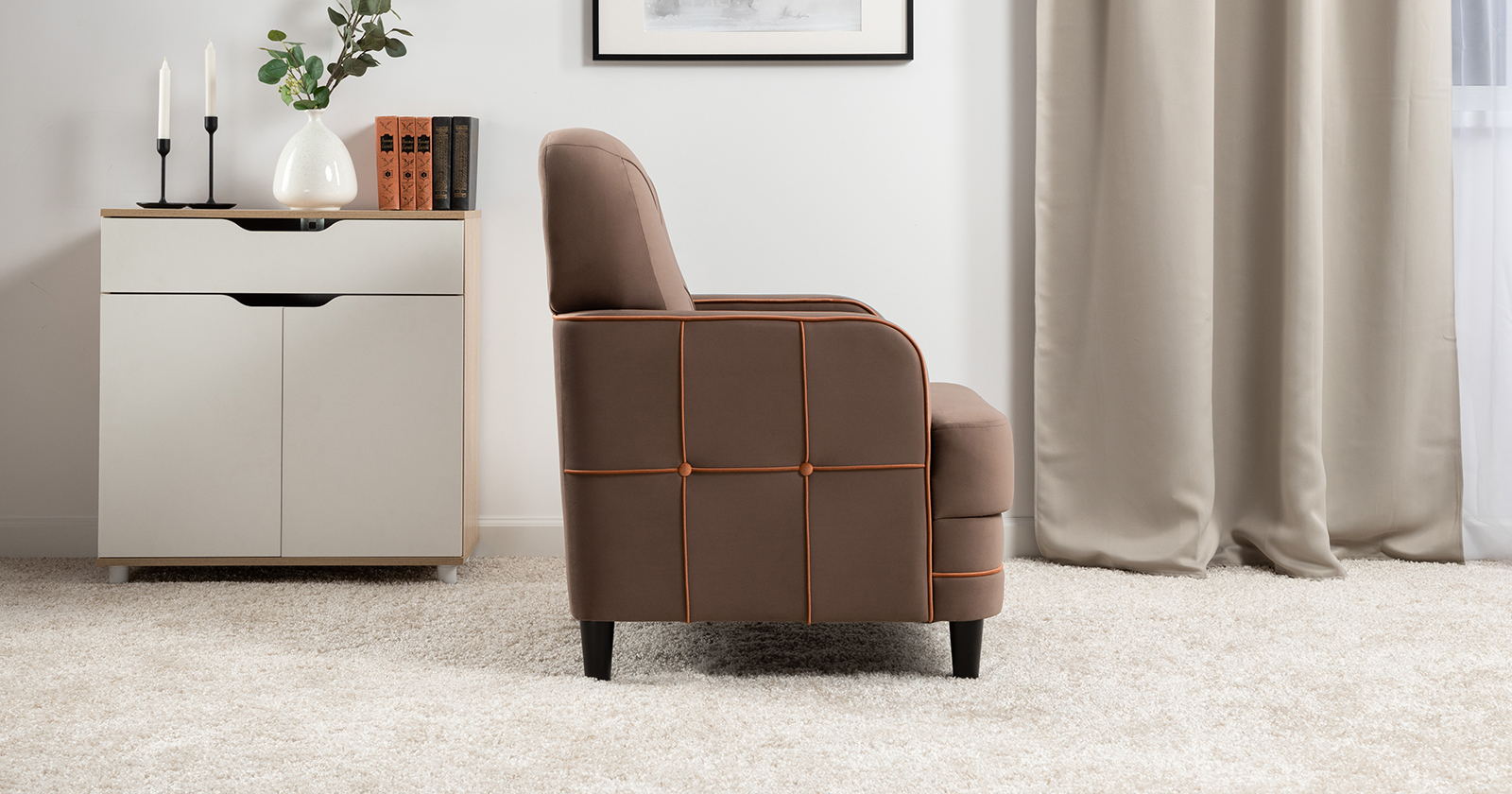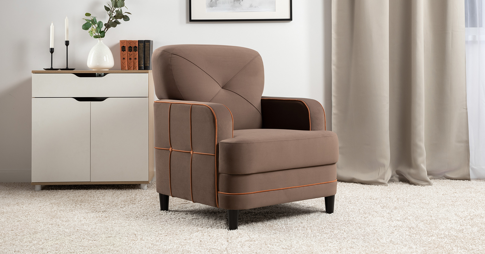 Декоративные канты на вставке подлокотников. Пуговицы в местах пересечения кантов на подушке и вставке подлокотников. По торцам подлокотников и думках контрастный декоративный кант. Защипы на сиденье и подушке.