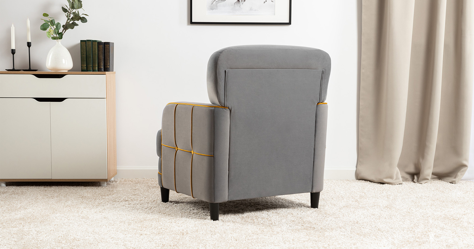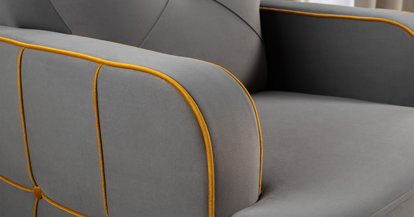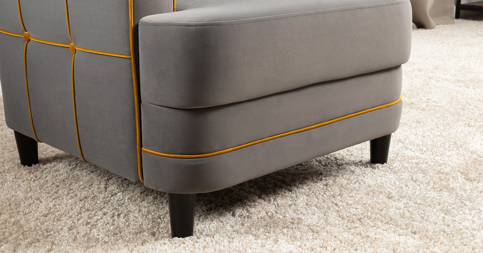 Декоративные канты на вставке подлокотников. Пуговицы в местах пересечения кантов на подушке и вставке подлокотников. По торцам подлокотников и думках контрастный декоративный кант. Защипы на сиденье и подушке.