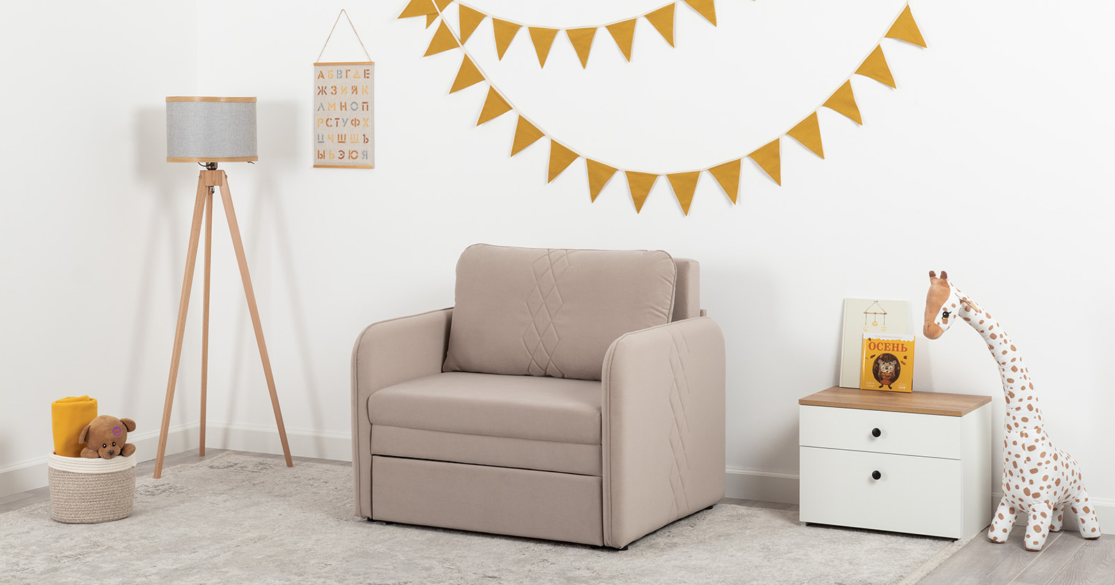 Стильный компактный диван для детской и гостиной. При своих скромных размерах он трансформируется в полноценное спальное место для детей и подростков. Лаконичный дизайн в виде декоративной стежки подчеркивает фактуру велюра, а небольшие размеры позволят разместить его в любом пространстве.