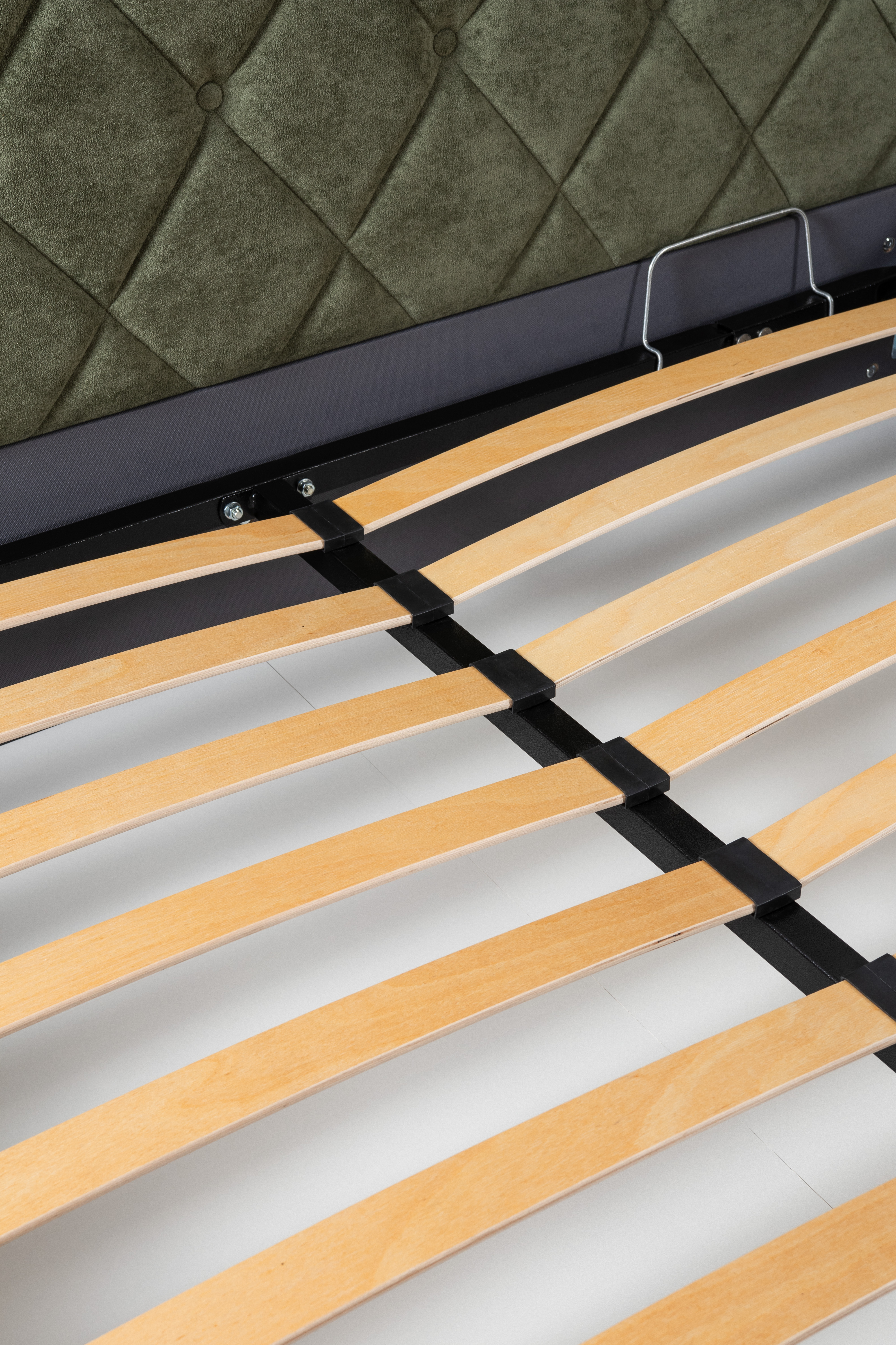 Основание кровати укомплектовано матрасодержателями. Жесткое кроватное дно из ЛДСП 16 мм на опорах 25 мм.