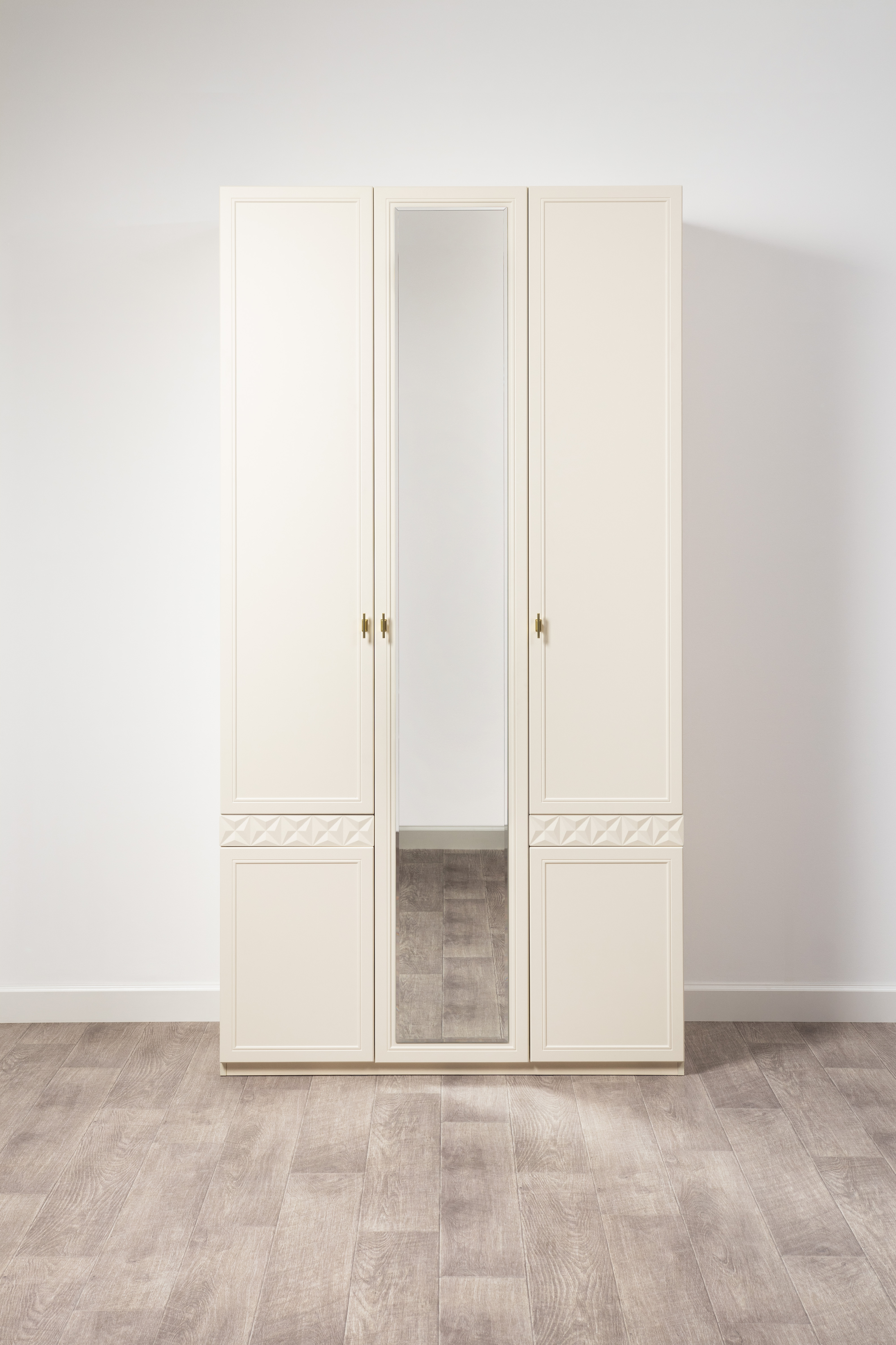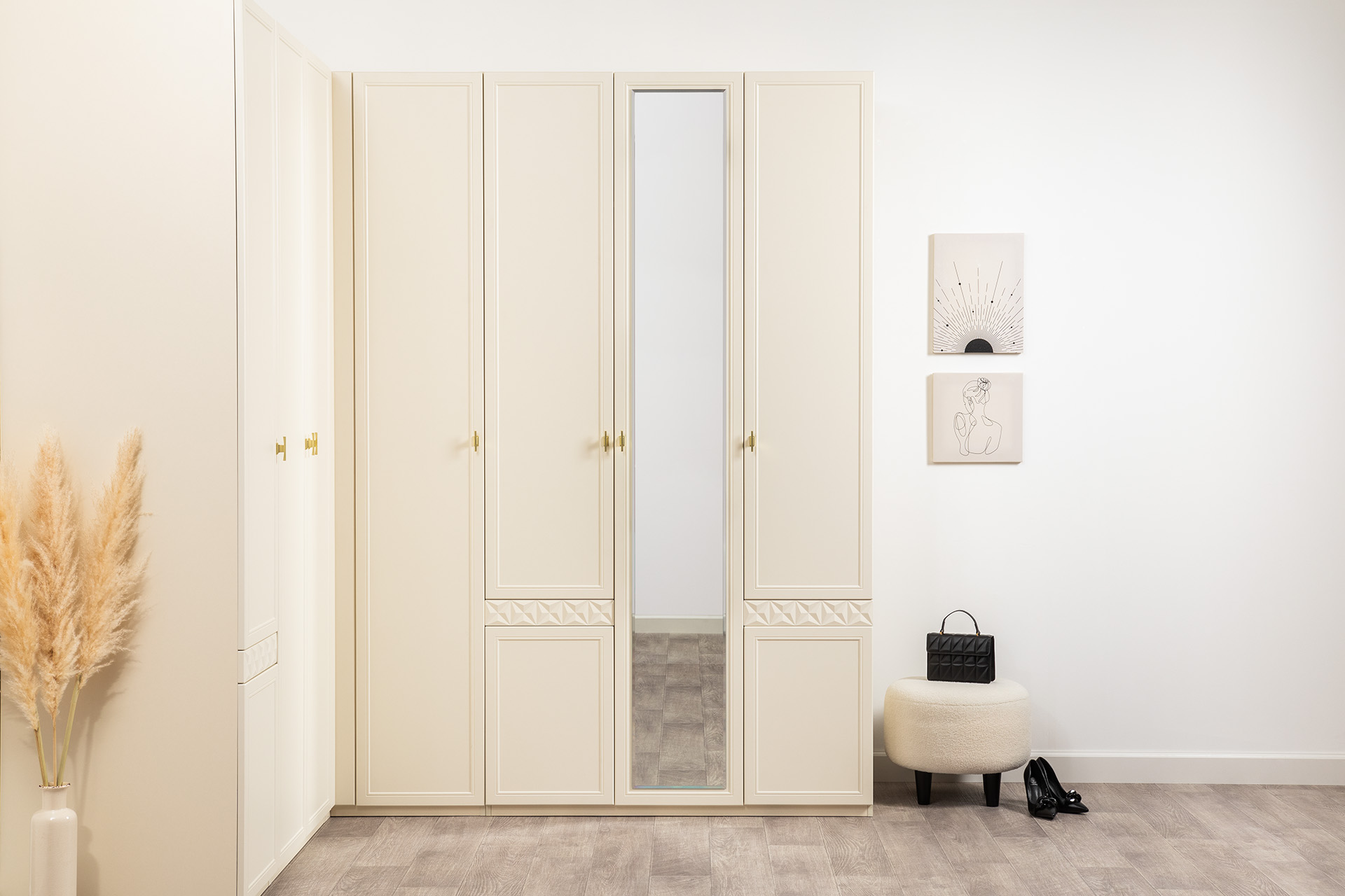Изящные линии, глубокая фрезеровка фасадов из МДФ и благородные оттенки. Утончённая «Слоновая кость» и изысканная «Олива Шагрень» с глубоким зелёным тоном — создают атмосферу уюта, тепла и благородства. Металлические ручки и опоры золотого цвета придают мебели утончённый блеск, а петли и направляющие с доводчиками обеспечивают плавное и бесшумное закрытие фасадов.