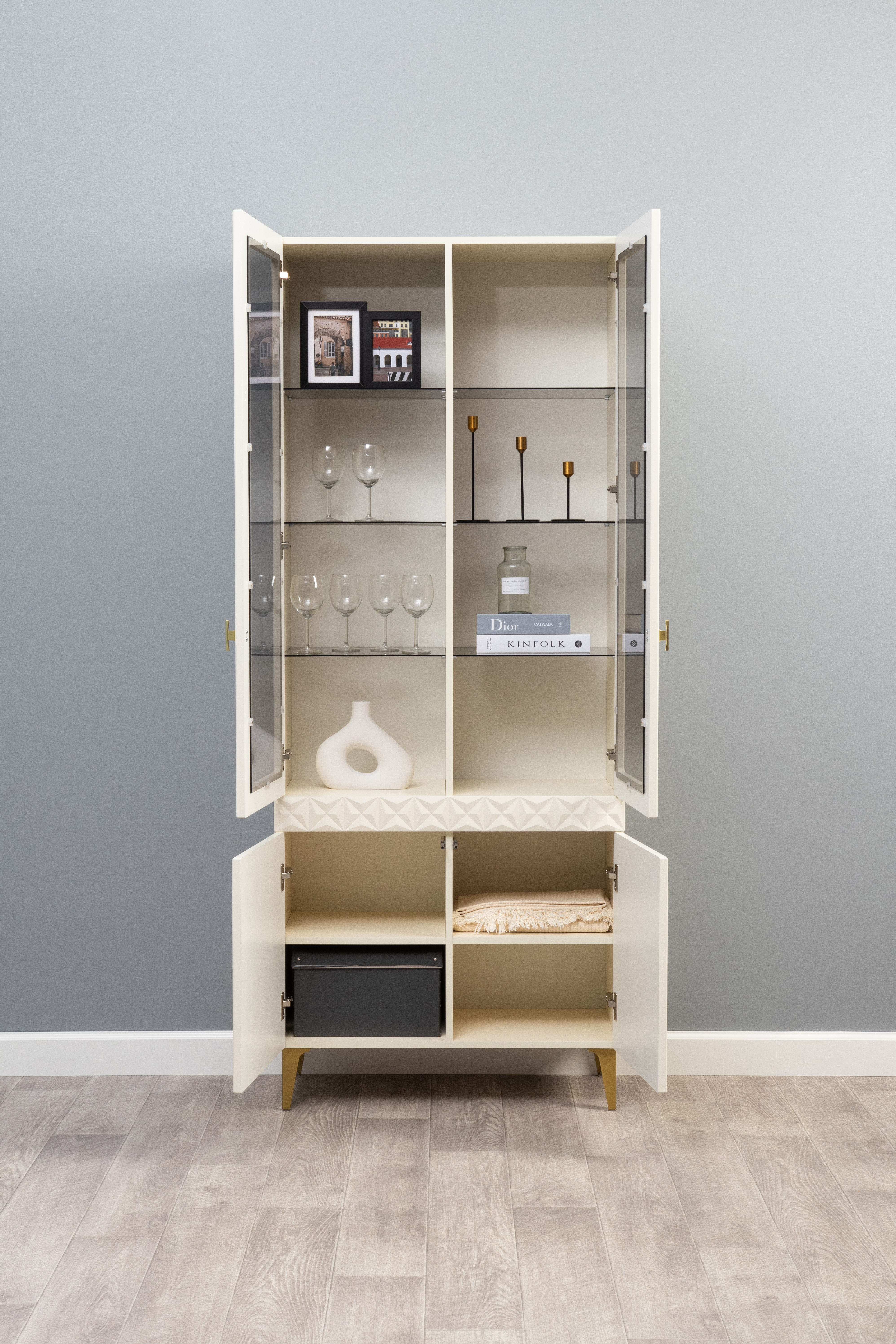 В коллекции представлены три типа витрин с тонированным закалённым стеклом, которые придают пространству лёгкость и свет. «Марион» — идеальное сочетание традиций и актуального дизайна в каждой детали.