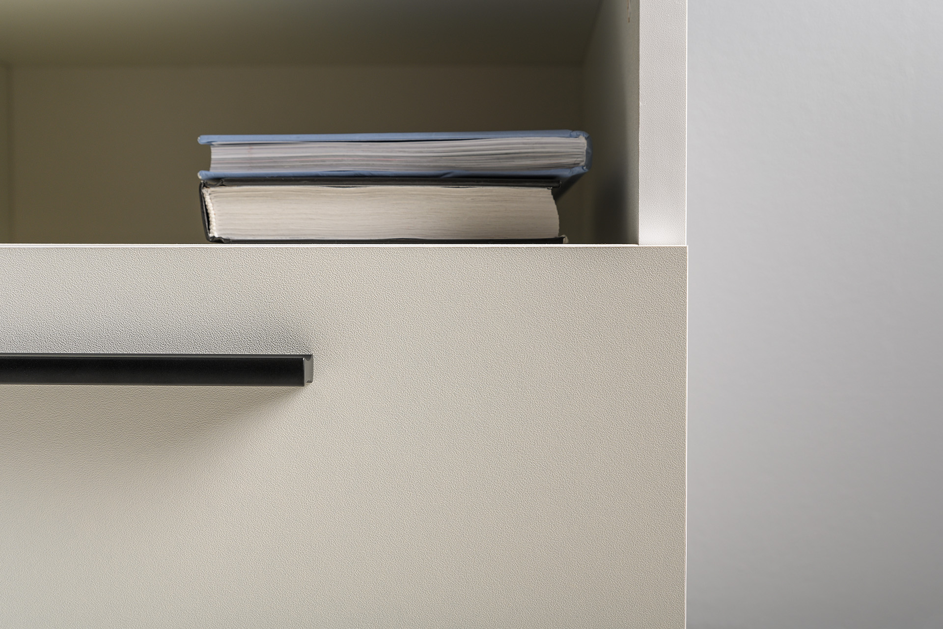 Два варианта кровати: ширина спального места 1200 и 1600 мм. Вместительный трёхстворчатый шкаф полноценной глубины с выдвижными ящиками и съемными полками. Ящики оснащены направляющими полного выдвижения.