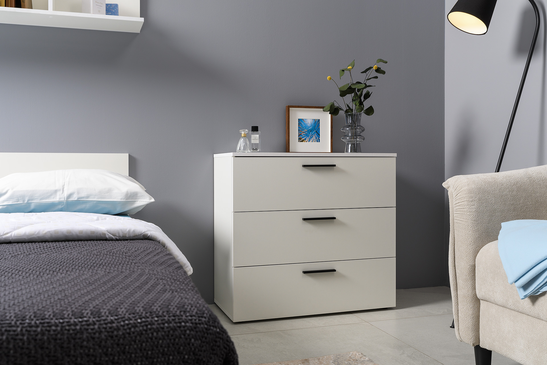 Два варианта кровати: ширина спального места 1200 и 1600 мм. Вместительный трёхстворчатый шкаф полноценной глубины с выдвижными ящиками и съемными полками. Ящики оснащены направляющими полного выдвижения.