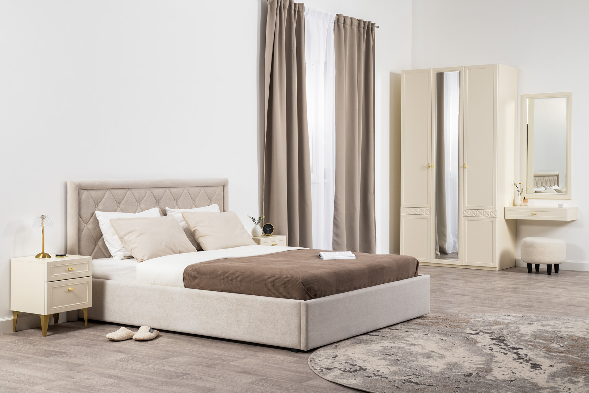 Спальня Дакота композиция 1 меренга, белый, с кроватью Ингрид/Ingrid 1600 велюр ультра смог/ultra smoke, пуф Альба 450 велюр ультра смог/ultra smoke